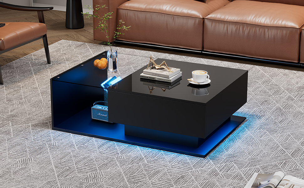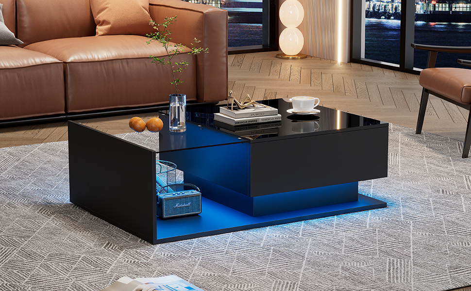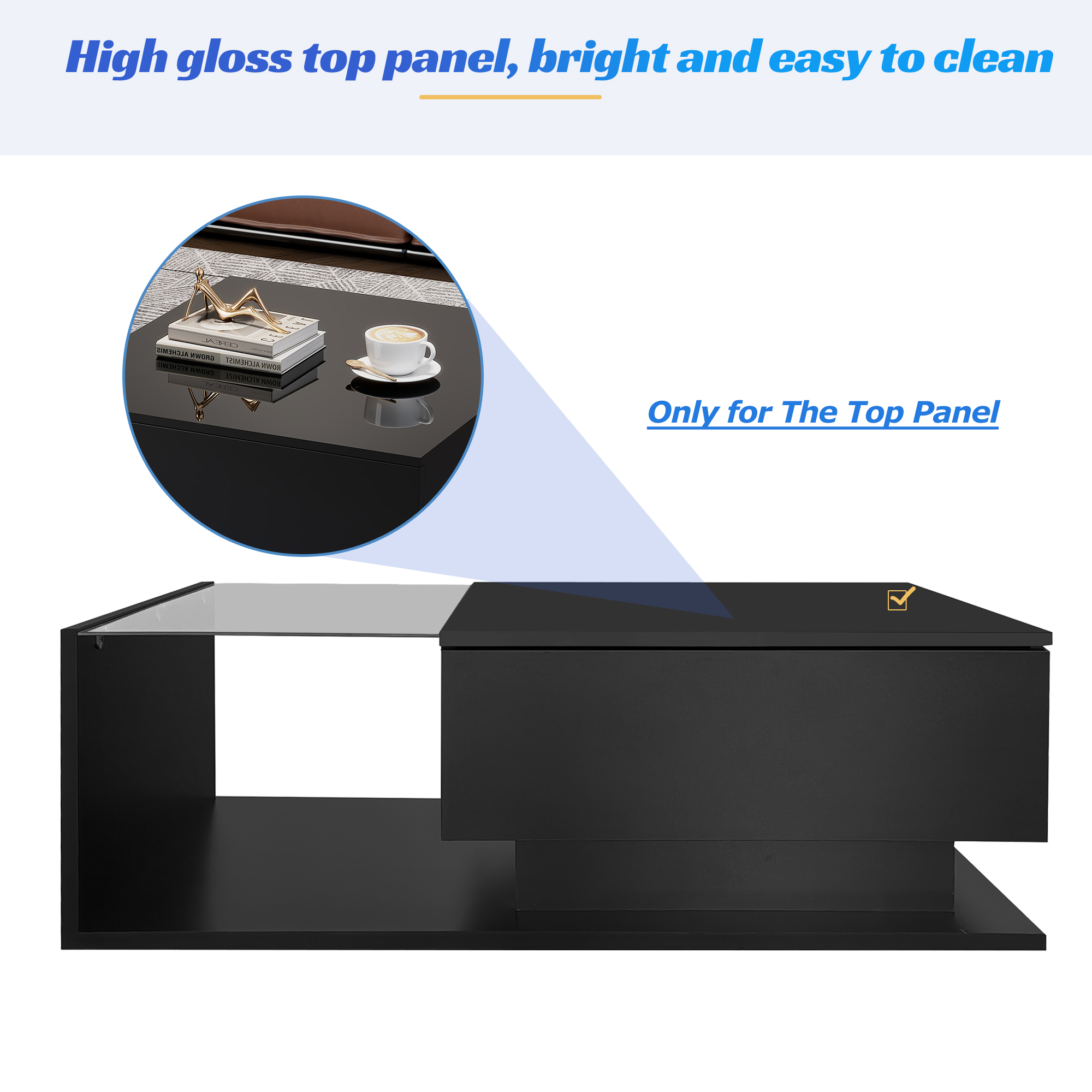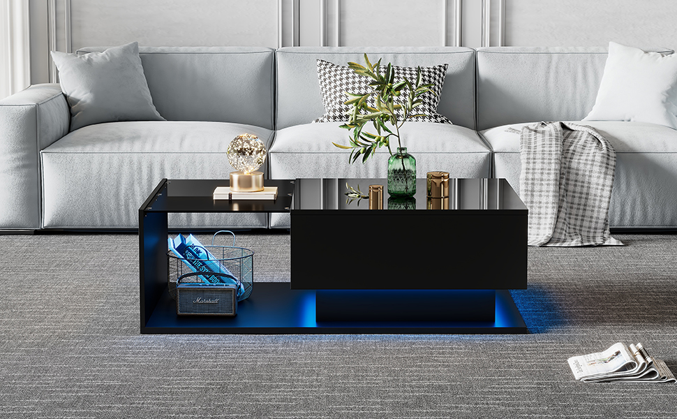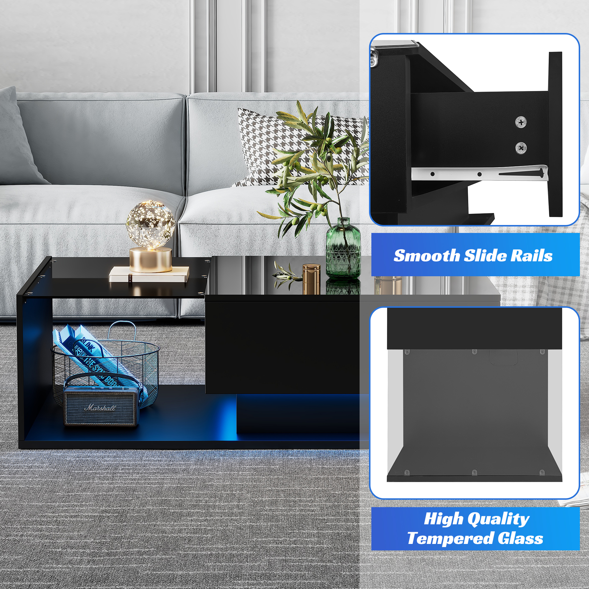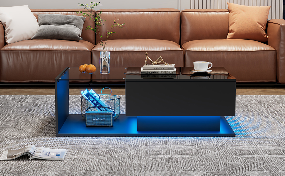 Product Name:LED Coffee Table, Modern High Gloss Coffee Table, Center Table with Glass, Modern Coffee Table for Living Room with Drawer (Black)